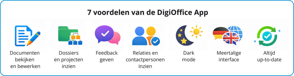 Met de DigiOffice App heb je altijd de laatste versie van documenten en contactgegevens van relaties bij de hand én een handig overzicht van je taken. Dit zijn de 7 voordelen van de DigiOffice App: